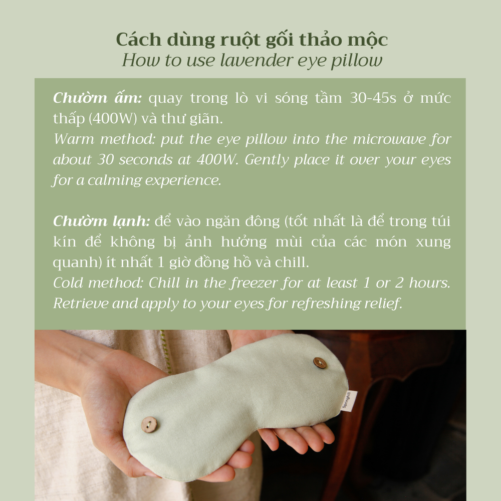 - Tháo rời dây đeo và thay ruột thảo mộc để sử dụng như gối chườm mắt, có thể chườm nóng, lạnh hoặc dùng trực tiếp