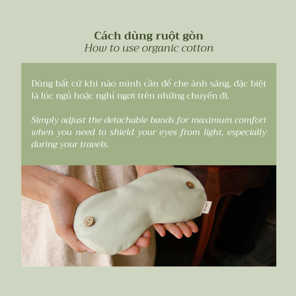 - Sử dụng dây đeo và ruột gòn organic cho chức năng bịt mắt ngủ.