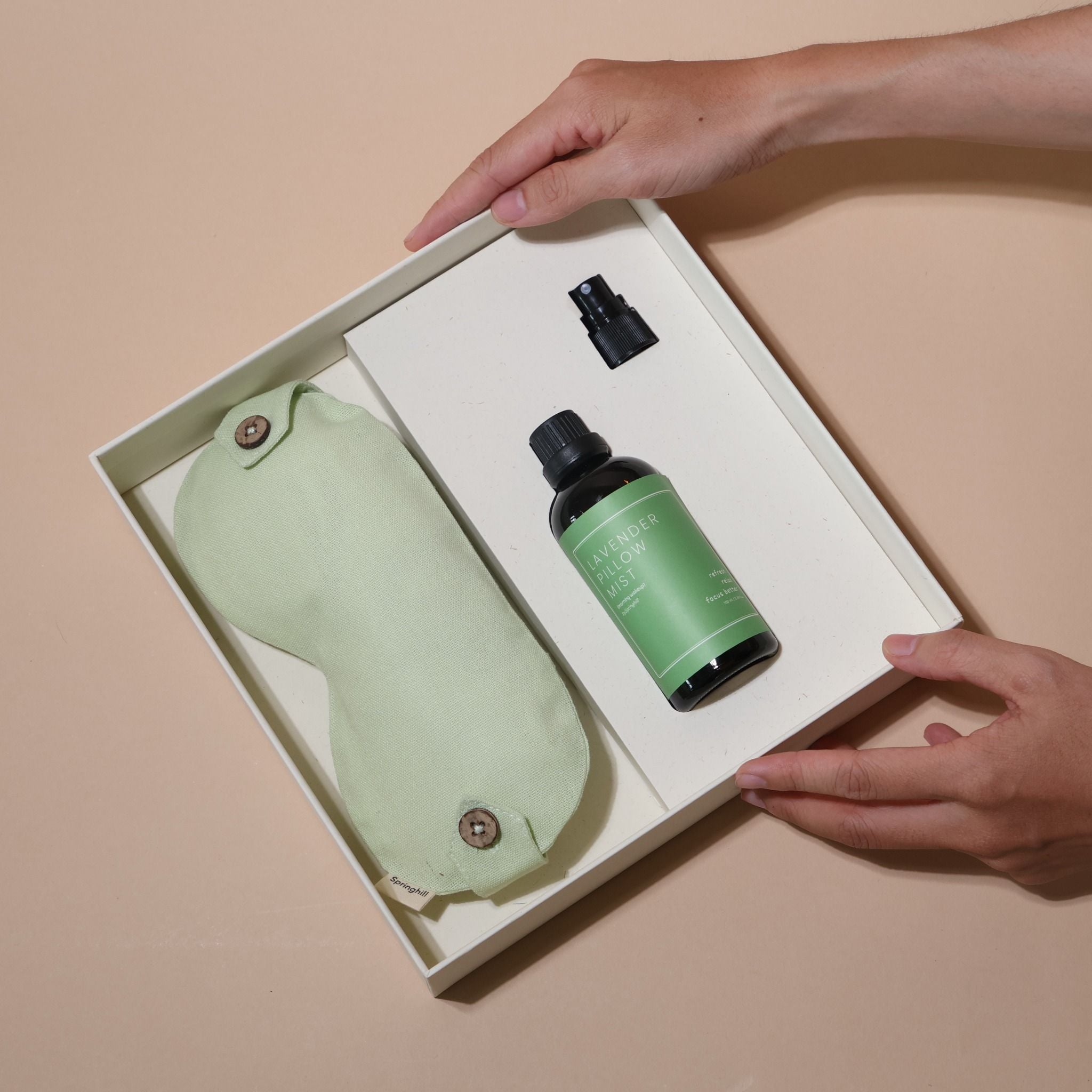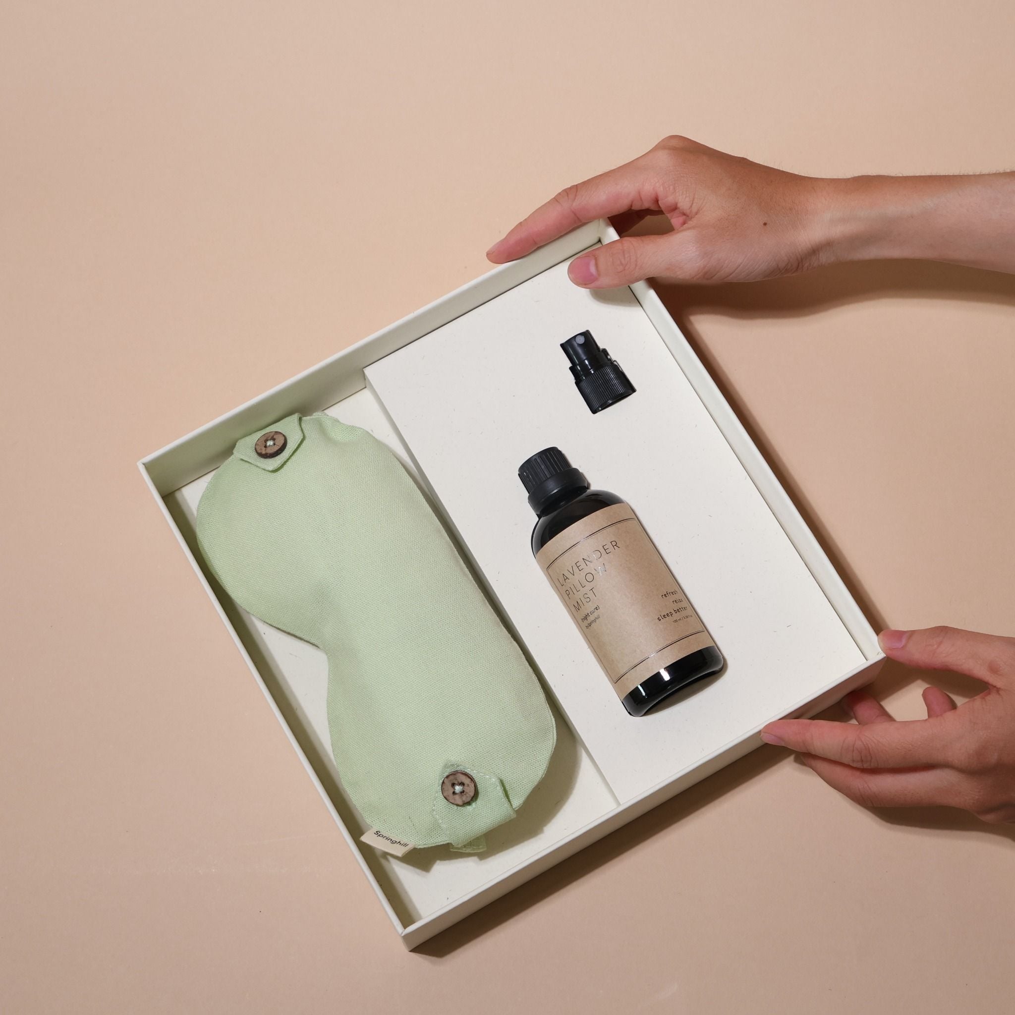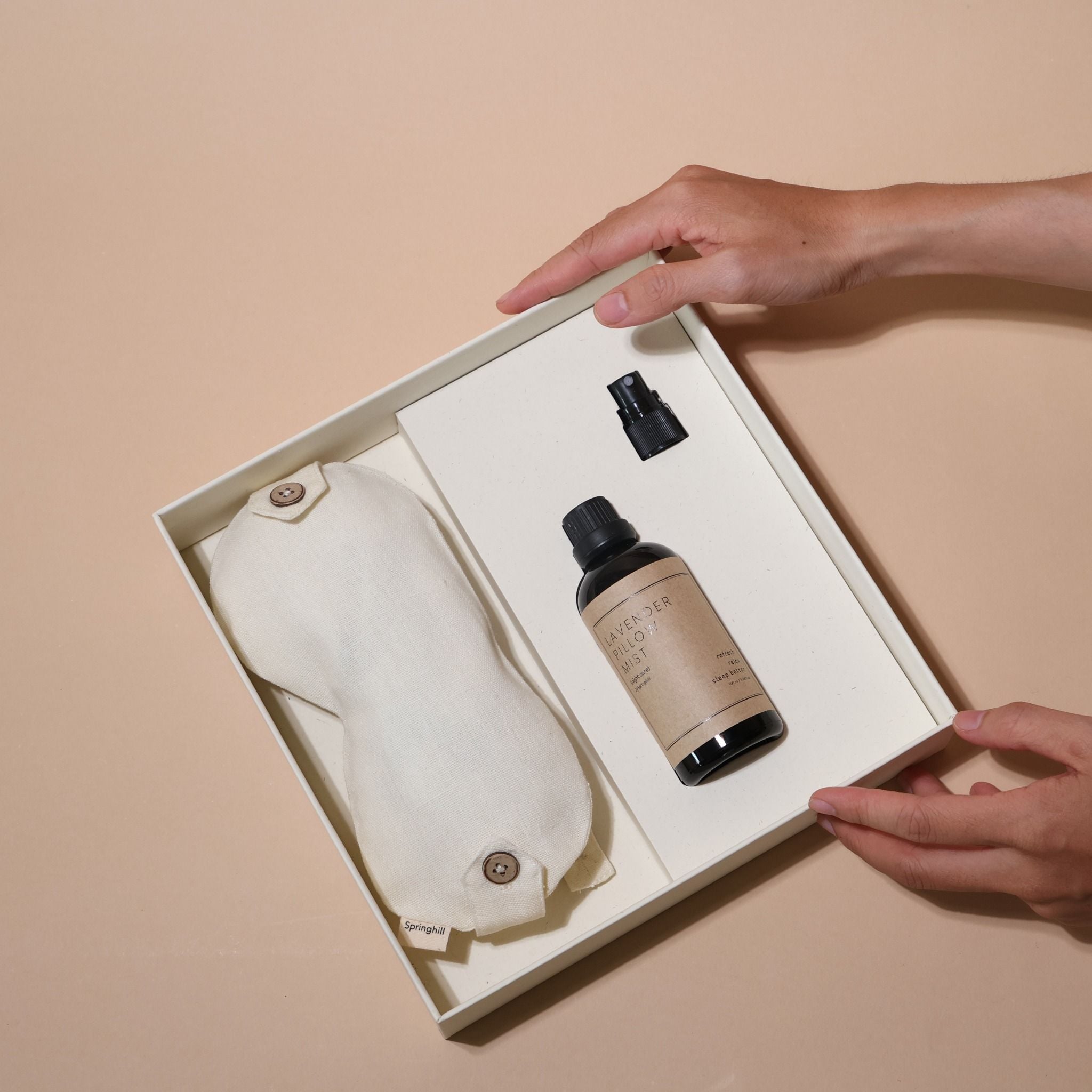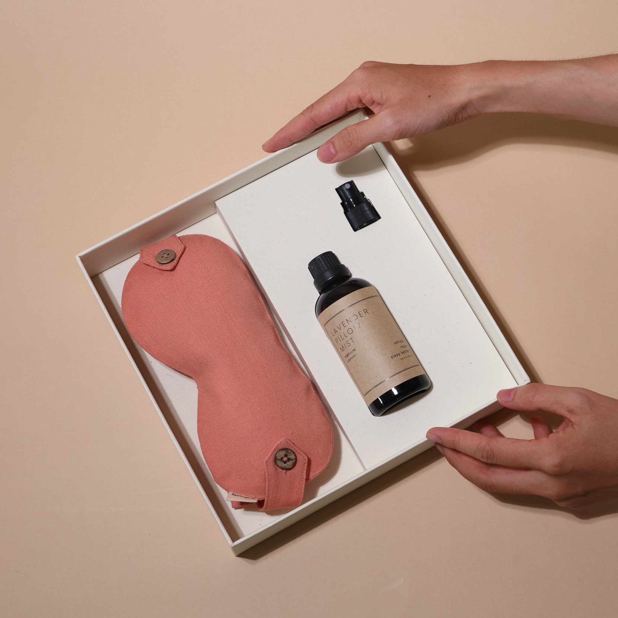 Care Box giấc ngủ bao gồm một bịt mắt ngủ thảo mộc 2-trong-1 và một chai xịt thơm vải.
